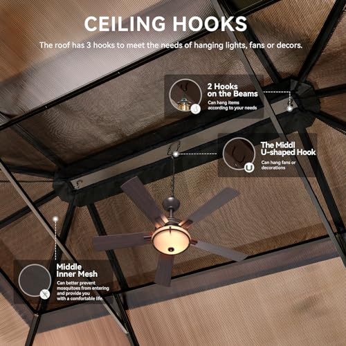 Design of Double Top:This patio gazebo is produced with double-layer polycarbonate top, which prevents harmful UV rays while allowing air circulation. Besides, there are hooks designed in the middle of the steel roof for lamps or fans hanging. Each hook can hold up to 44lbs