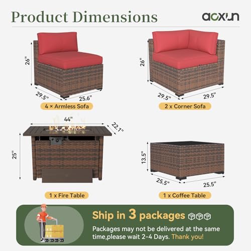 Aoxun 8 Piece Patio Furniture Set with 44” Fire Pit Table Wicker Rattan Outdoor Sectional Sofa Set with Coffee Table and Thickened Cushions, Red (Waterproof Cover Included)