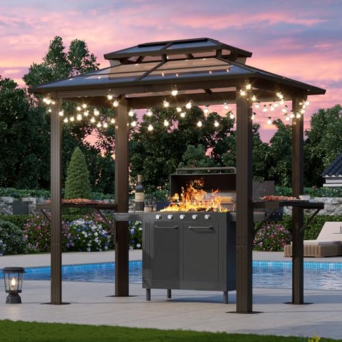 ?Design of Handy Shelves?Featuring double-sided metal shelves, the hardtop gazebo has enough space to display barbecue accessories, plates and ingredients, offing much convenience when you grill. Also, there are practical cutlery hooks provided for barbecue items hanging