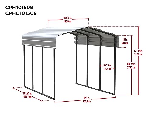 DIMENSIONS: The fully assembled Arrow Sheds steel carport measures 120" W x 183.25" D x 123.15" H, or 10' W x 15' D x 9' H; this unit contains 4 packages: you will receive 3 frame cartons and 1 roof panel carton