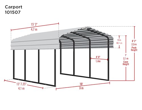 DIMENSIONS: The fully assembled Arrow Sheds steel carport measures 120" W x 183.25" D x 98.4" H, or 10' W x 15' L x 7' H; this unit contains 3 packages: you will receive 2 frame cartons and 1 roof panel carton
