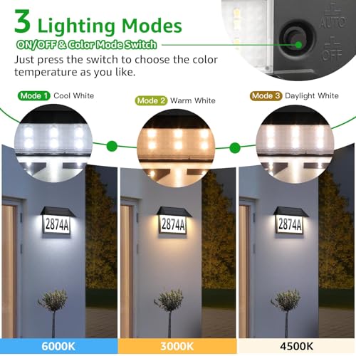 3 Lighting Modes:The solar-powered address sign light combines three lighting modes - Mode 1: Cool White 6000K(ON), Mode 2: Warm White 3000K, Mode 3: Daylight White 4500K in one light. You can simply press the switch button beneath the solar panel to set a favorite lighting color. Note: 1. Please turn ON the switch to choose color mode before the FIRST charging. 2. Please DO NOT install the sign under the eaves or anywhere which might cover the solar panel, otherwise it will lead to insufficient sunlight transformation, and may cause the light do not work or lighting time is short