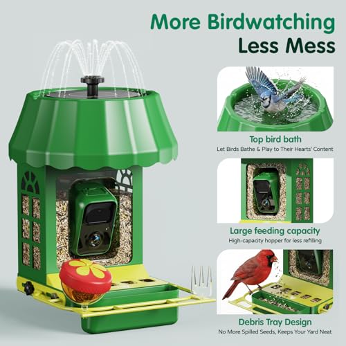 SOLID METAL, CHEW-PROOF: Stop wasting money on bird feeders for outdoors,Our bird feeder with camera is constructed from solid metal, chew-proof metal, making it truly, indestructible against squirrels, raccoons, and extreme weather. Monitor & interact with backyard visitors through app.
