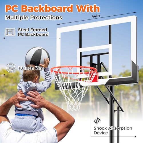 ?SECURE STABILITY & DURABLE?AWII SPORT Outdoor Basketball Hoop uses Q195 thickened steel support rods and weather-resistant coatings which are built to withstand various weather conditions. Upgraded shatterproof 44" PC backboard, which is bonded with permanent glue no longer worries about warping. The shock-absorbing bumper design of the 18" standard-size rim can reduce the impact force caused by the collision for more stability.
