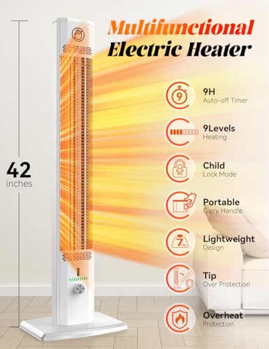 ?????42 INCH Heater with 1S Fast Heating?Our 42 Inch tower heater provides warmth in a 100° wide-angle heating range, you can share warmth with family and friends during the cold season. With a heating area of?up to 300 square feet, electric heater indoor is the perfect choice for quickly heating the house in winter. 1S fast heating provides instant concentrated heat that transfers heat directly to your body, making you feel comfortable and warm instantly.
