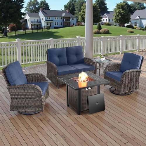 Belord 5-piece outdoor patio furniture set is the perfect addition to any outdoor space, combining comfort, durability, and functionality. It includes two swivel rocker chairs, a loveseat glider chair, a side table, and a 30-inch propane fire pit table with a powerful 50,000 BTU output, designed to elevate your patio experience. The outdoor furniture set high-quality materials and versatile design make it ideal for outdoor living, whether on your patio, garden, or poolside.