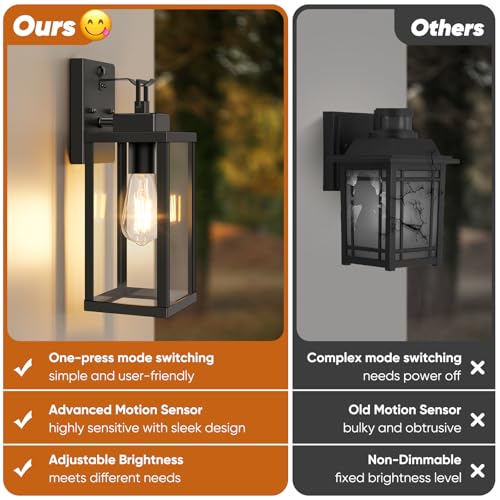 2025 Upgraded Motion Sensor Outdoor Lights: BesLowe is a brand dedicated to outdoor wall lights. Equipped with advanced PIR motion and photocell sensors, this outdoor wall lantern offers 3 customizable lighting modes for optimal energy efficiency and security. Beyond that, this outdoor motion sensor light utilizes the latest sensor design for a sleek look and easy operation. With a simple click, you can effortlessly switch between motion sensor modes and say goodbye to complex steps