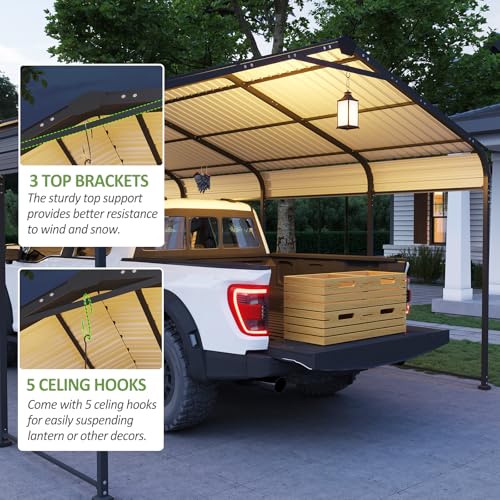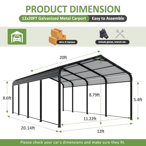 Extra-large Functional Space: This carport serves as an outstanding storage solution. With dimensions measuring 241.7" in depth, 144.2" in width, and 105.5" in height, the outdoor carport features a completely open layout, facilitating easy access for storage and providing great versatility. Whether you require a shelter for your cars, trucks, or even boats, or a functional area for your hobbies, this carport meets all your needs.