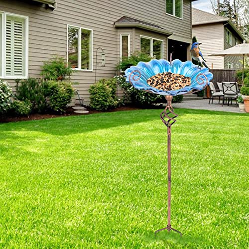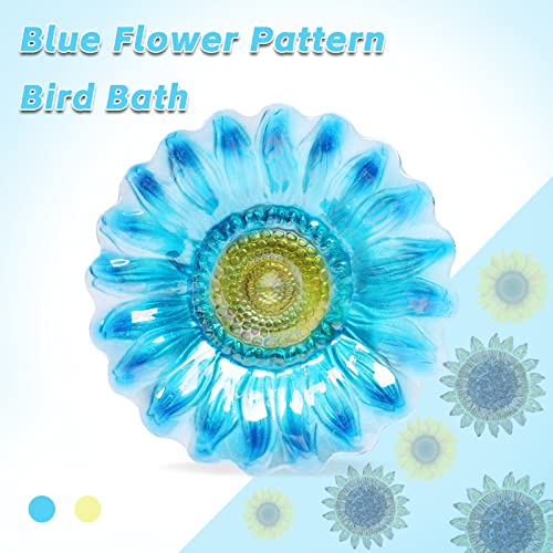 New Upgrade - Bird bath is made of handmade glass, the birdbath bowl has a beautiful blue sunflower pattern, and metal stake base is upgraded to four-pronged bottom, which greatly increases the stability of glass bird bath