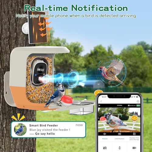?2.5K HD Bird Camera, Enhanced Viewing Experience?This 2.5K camera bird feeder captures detailed videos and images of bird visitors day and night. The 140° wide-angle camera provides a clear field of view, and the smart bird feeder with camera supports two-way audio, you can listen to the voices of bird friends and communicate with them through the app. When birds fly to your smart bird feeder camera, you can receive app notifications in real time.