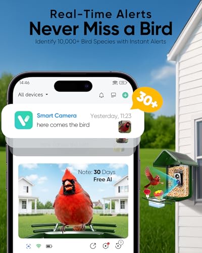 ?Live Camera Bird Feeder Experience?Experience vibrant bird life up close with the 2K HD camera, capturing each bird's striking colors and unique behaviors in vivid detail. Watch the golden feathers of finches and the lively hops of cardinals with crystal clarity, fully immersing you in their world without disturbing them. Get real-time alerts when new feathered visitors arrive, so you never miss a special moment