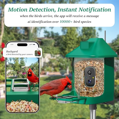 ?AI Identify and Arrive Notification?A birdwatching assistant right in your backyard! smart bird feeder with camera built-in AI, can auto-capture and recording videos, recognizes visiting birds over 10,000+ species and provide the corresponding bird knowledge. When the bird arrives, your mobile app will receive real-time notifications, won't miss a moment.?30 day trial AI and cloud service, subscription starts from 1.99$ after the trial ends?