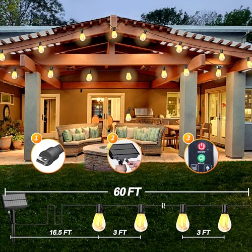 60 FT Solar-Powered Flexibility, Durable copper wire with 15+2 shatterproof LED bulbs for versatile outdoor/indoor decoration. Auto-charging solar panel provides 8 hours+ of illumination; Each bulb is spaced 3-feet apart, Ensuring optimal lighting coverage