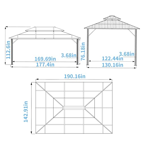Ample Space for Entertainment - With dimensions of 142.91’’D x190.16’’W x 112.6’’H, this patio gazebo offers plenty of room for outdoor furniture, BBQs, or family gatherings. The reinforced roof hooks can allow you to hang fans or lights or even small greenery to add more interest to your gazebo.