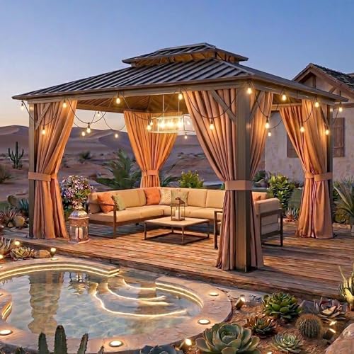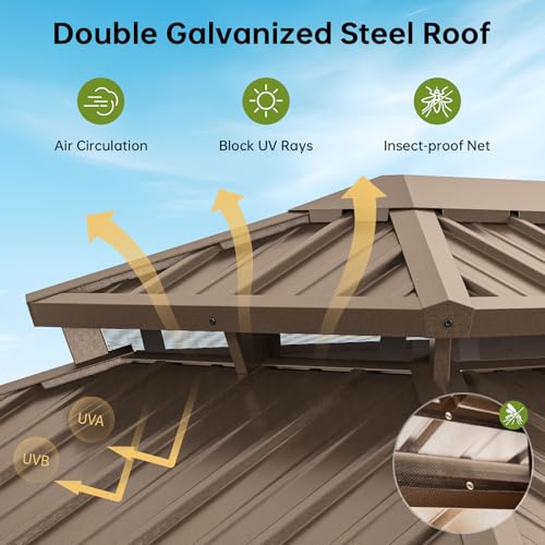 Durable Double Roof: This hardtop gazebo features a rust-resistant galvanized steel double roof, engineered to withstand heavy snow, 38mph winds, and extreme weather. The hardtop gazebo design blocks 99% of UV rays while optimizing insulation and ventilation for a cool outdoor retreat.