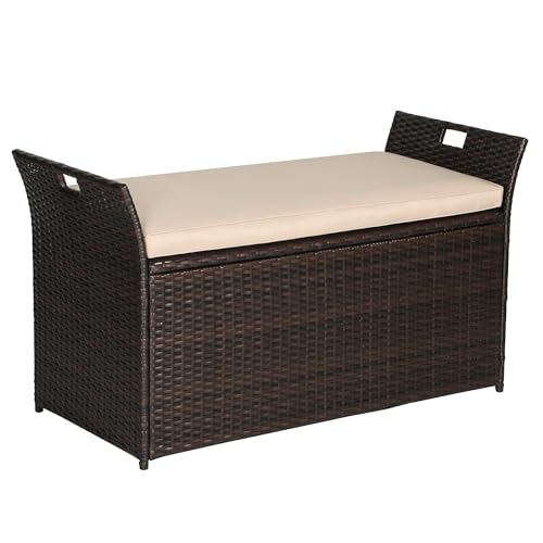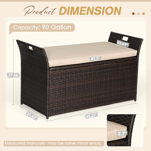 Brightpeak 90 Gallon Patio Storage Bench, Outdoor Wicker Deck Box with Cushion, PE Rattan Box with Handles (Brown)
