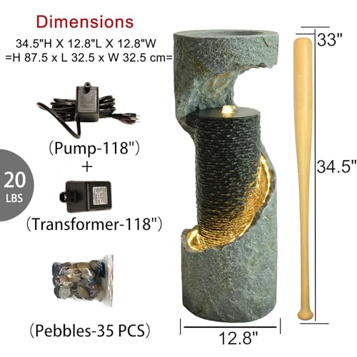 SIZE & PACKAGE: Measures 12.8"L X 12.8"W X 35.4"H Garden Water Fountain Was Perfect Addition To Your Outdoor Decoration. Package Include: Garden Fountain*1 (20 Lbs), Transformer*1,Pump*1,Instruction*1