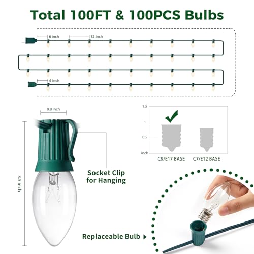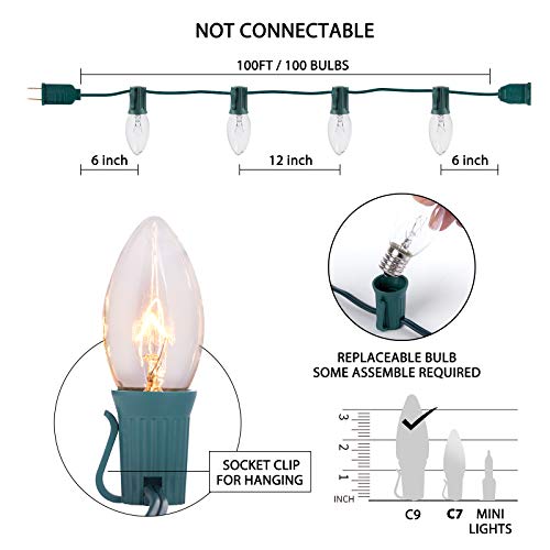 Christmas string lights, 100 pack C9 clear warm bulbs, 6 inch lead with male plug, 12 inch spacing between bulbs, 6 inch tail with female connector; lighted length 99 feet, total length 100 feet, Not Connectable
