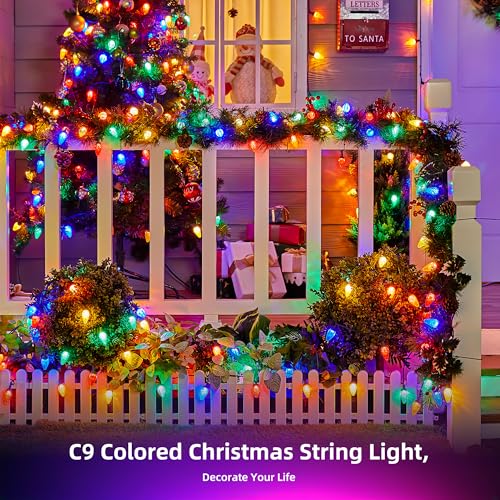 Super Bright: The C9 led christmas lights outdoor has 150 count multi-colored bright C9 LED bulbs, diamond-shape caps, brighter than traditional incandescent string lights, flicker-free lighting, brighten up your Christmas tree, yard, patio, garden or anywhere you want a colored glow.