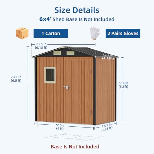 ?Large & Versatile Storage Solution??Canovire 6x4 ft storage shed (72.5"Lx47.1"Wx78.1"H) offers versatile storage for outdoor gear, gardening tools, seasonal items, or even as a pet shelter. Its ample storage space adapts to your needs - limited only by your imagination. Frame floor not included