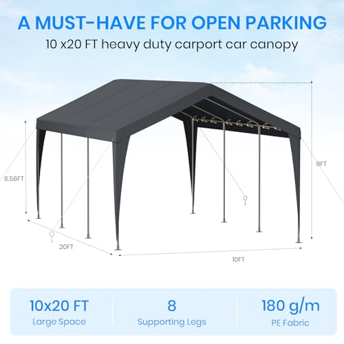 ?Easy&Large Portable Garages?-This 10 x 20 FT metal carport is an open-design canopy with an all-season tarp that you can drive right up to. 10*20 FT size provides ample space for vehicles, yard supplies, lawnmowers, bikes, etc. Whenever there are not enough parking spaces, the venue is too small, and the sun is too strong for a party, this temporary tent garage is a perfect solution to your problems.