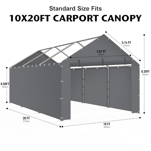Side wall dimensions: 20' L x 6.56' H. End panel waterproof fabric dimensions: 10' L x 9.35' H, designed to fit most 10' x 20' carport frames. Please ensure frame dimensions before purchase.