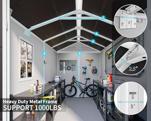 ?????PREMIUM AND DURABLE Material?The 14mm tough double-wall resin construction, 0.6 mm galvanized steel frame and impact-resistant floor are designed for long-term durability. The double-wall panels are waterproof and moisture-proof, allowing worry-free use in all weather conditions. It is weather-resistant, waterproof, and UV-resistant-no peeling, rotting, or rusting. The screws are embedded to ensure aesthetics and safety.