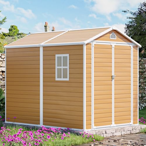 ?????Practical Design?This outdoor waterproof storage shed features a sloping roof, preventing water accumulation. The lockable door enhances security and prevents accidental entry of small animals. T-holes in the side frame allow hooks to hang something like baskets and ponchos. The vents, window and the top reflector design provides plenty of natural light and ventilation. It allows the visibility of tools from the outside and enhances the aesthetics of the shed.