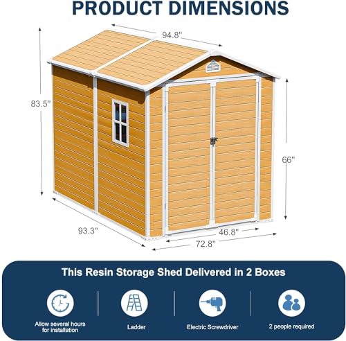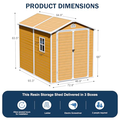 ?????SPACIOUS OUTDOOR SHED? 8x6FT Overall dimensions: 94.9"D x 74.4"W x 83.5"H , Roof Size: 94.9"x 74.4", Base Size: 93.3" x 72.8", Double Door Size: 46.9" x 65.4", Window Size: 16.1" x 22.0", with sufficient height for an adult to enter. It is a practical backyard shed, large enough to accommodate various household items such as lawnmowers, ladders, Patio Furniture and bikes. It is comfortable to use without feeling cramped.
