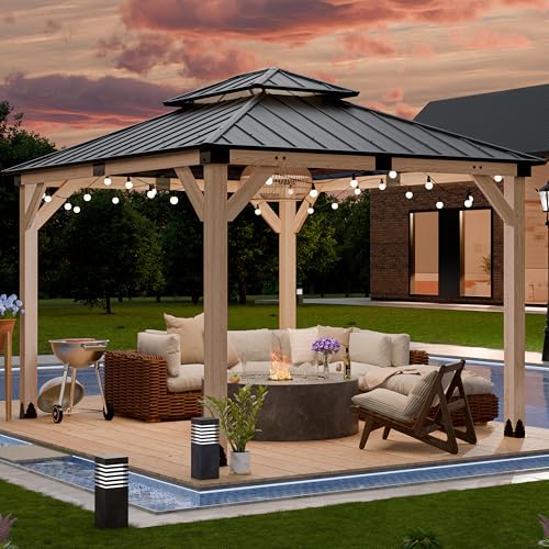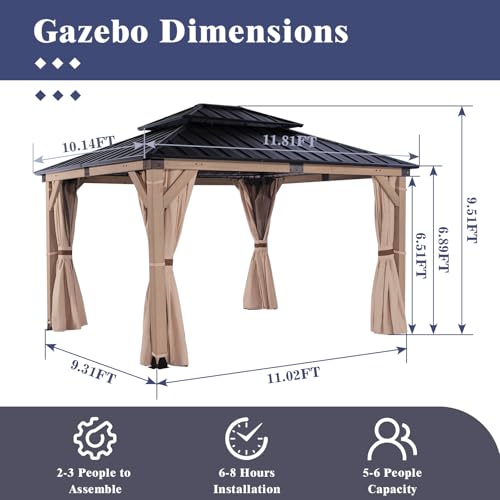 LARGE ROOMY INTERIOR — With dimensions of 12.8ft x 11.02ft x 9.51ft, the patio wood gazebo offers a generous effective SHADE AREA OF 120.82 SQUARE FEET! The pavilion comfortably accommodate gatherings of 5-6 people, making it ideal for family get-togethers, garden parties, and other festive events.
