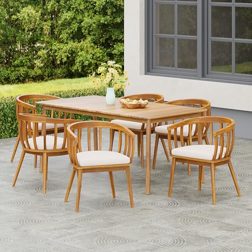 7-Piece Outdoor Dining Set: Includes 6 finely crafted acacia wood chairs and a spacious table, offering a cohesive solution for outdoor meals, BBQs, or casual lounging. The natural wood finish and durable build make this patio table and chairs set ideal for any backyard or deck