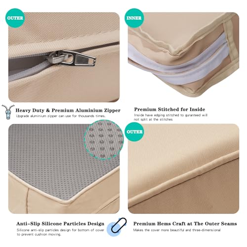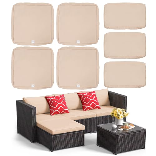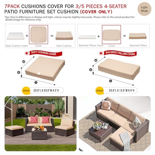 DIMENSION & QUANTITY--This 7 pack outdoor patio cushion slipcovers set fits for 3/5 pieces/4-person seating patio furniture set(patio sectional sofa set,patio conversation set) seat cushions and backrest pillow cushions,These outdoor cushion covers total Included 7Pack cushion covers(Light Khaki), 4Pack -Seat cushion covers (23.6Lx23.6Wx3H Inch),3Pack-Backrest pillow cushion covers (23.6Lx13.5Wx4H Inch) -(COVERS ONLY,INSERT CUSHIONS NOT INCLUDED).