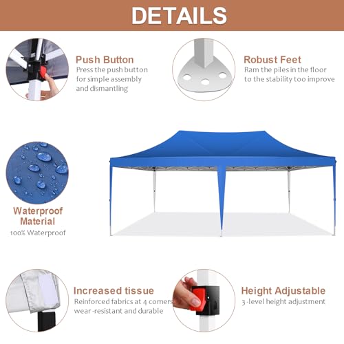 3 Adjustable Heights&Removable Sidewalls: COBIZI 10x20 event tent height adjustable, you can adjust it as you need, 300 cm - 310 cm - 320 cm.Improved thumb lock system can protect your fingers from pinching.The double-zippered walls provide airflow control, making it ideal for vendor booths at farmers' markets or outdoor exhibitions.COBIZI 10 by 20 tent includes 6 removable sidewalls is perfect for 4-Season and enhanced privacy.