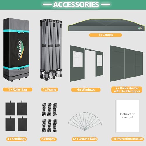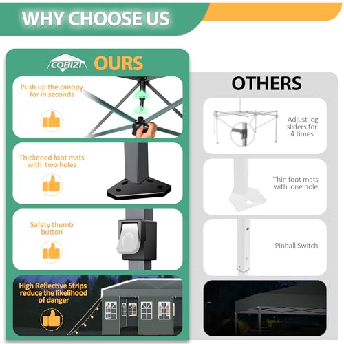 ?Easy Set Up with One-Touch Central Button?COBIZI 10x20 pop up canopy features a central button and an assembly folding frame?you can set it up with one push, and take it down with a simple pull.Say goodbye to complicated and time-consuming tent setups and hello to more time spent enjoying nature with our easy to use 10 x 20 outdoor canopy tent.