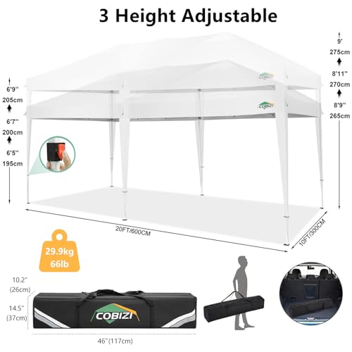 Easy Setup and Takedown: 10x20 pop up canopy tent is designed for hassle-free setup and takedown. With no tools required, two people can easily set it up by extending the legs and securing the frame. The 10x20 canopy folds neatly into the included carry bag for easy transportation and storage, making it perfect for any outdoor event.