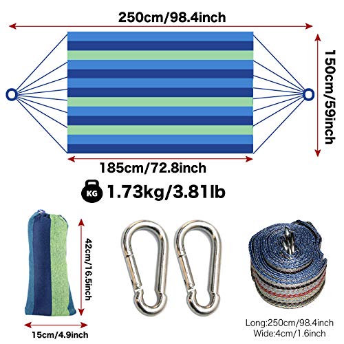 ?High Quality Double Hammock?The double camping hammock made of cotton canvas, load Capacity Up to 450 Lbs, enough to accommodate two adults. Hammock display size: 98 inches long x 59 inches wide, bed size: 73 inches long x 59 inches wide. The hammock can be used in a hammock stand or tree with a length of 8.5-10 feet.
