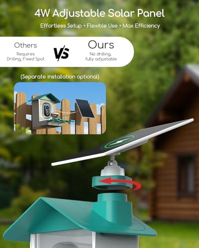 [Exclusive Solar Panel Design] This solar powered bird feeder features our proprietary solar panel design. We've upgraded the panel material by using premium BC-grade components, boosting charging efficiency by 30% and enhancing performance on cloudy days. Additionally, the unique roof mounting bracket maintains drill-free installation convenience while ensuring adaptability for removable and additional mounting scenarios?backyard, balcony, or garden)