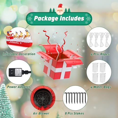 Complete Holiday Package: Unbox it all: Inflatable Santa sleigh with reindeer, UL adapter, blower, 8 stakes, 4 tethers, and 4 water bags. Just unpack and create instant holiday magic. Then folds 90% smaller post-Christmas for easy storage