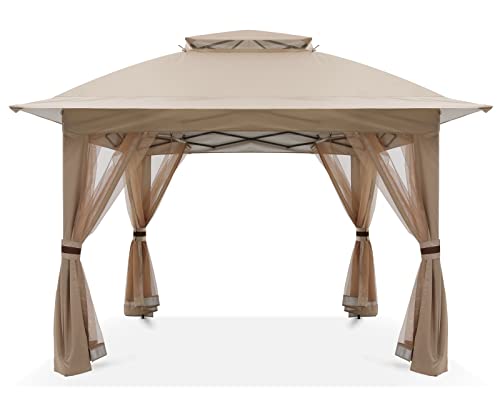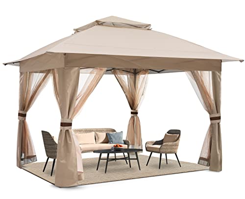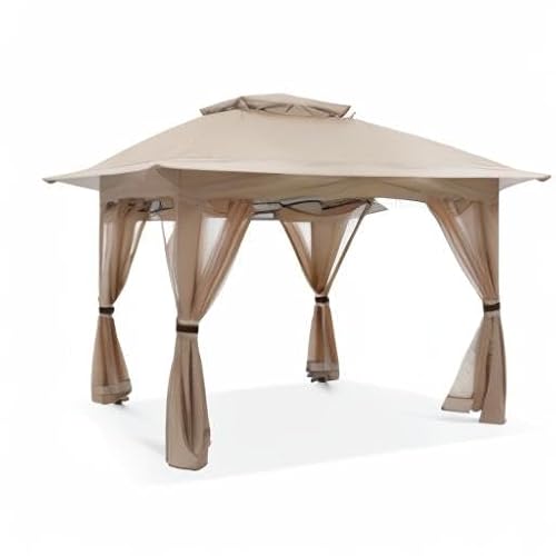 ?UNIQUE DESIGN ?1)Several drain hole is unique,alleviate water ponding.2) 13x13 canopy top, wide eaves, distributes addtional shade.3)The two-tier weather resistant roof provides stability in windy conditions, keeps proper airflow and helps reduce heat and wind stress on the canopy.4)Come with mesh netting which can keep bugs out?truly enjoy the outdoors.