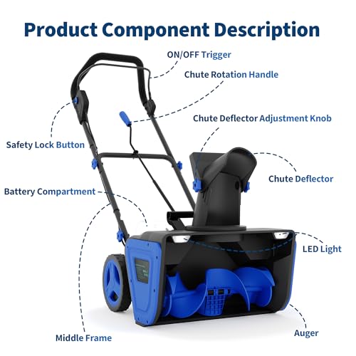 ?Dual Safety Protection?The battery operated snow blower features a two-step start: first press the safety lock, then press the start button to activate the machine. This effectively prevents accidental start-up, making it an ideal design for safe operation while wearing gloves in winter.