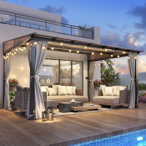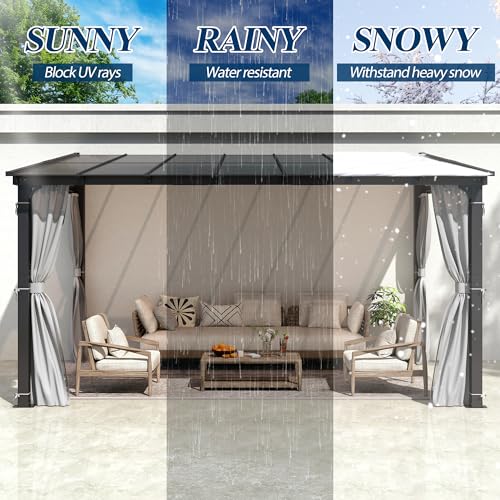 ????REINFORCED ALUMINUM FRAME: Outdoor polycarbonate lean to gazebo constructs with powder coated aluminum frame, which is sturdy, anti-corrosion and all weather resistant that stable enough can withstand heavy snow and wind for years of use. The patio hardtop gazebo with aluminum frame has reinforced wall-mounting hardware to provide extra durability and safety for attaching.