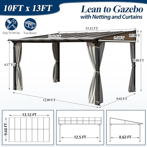 ????CONVENIENT DESIGN: The outdoor wall-mounted gazebo features dual tracks with hooks to hang the zippered netting & curtains, which can be adjusted to open or close by sliding the hooks on the track and the straps also can allow you to adjust the sidewalls coverage to fit your needs. The breathable netting and privacy curtains will be protecting you from bugs & UV rays while still having full airflow and visibility.