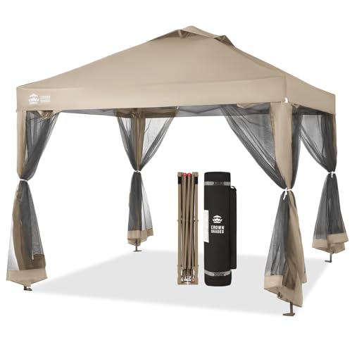 CROWN SHADES Gazebo 10x10 Pop Up Canopy with Mosquito Netting, Screen Tent with 4 Ropes, 8 Stakes, 4 Sandbags and Wheeled Storage Bag, Canopy for Patio & Backyard, Beige