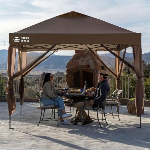 CROWN SHADES Gazebo 10x10, Pop Up Gazebo with Mosquito Netting, Screen Tent with 4 Ropes, 8 Stakes, 4 Sandbags and Wheeled Storage Bag, Canopy for Patio & Backyard, Coffee