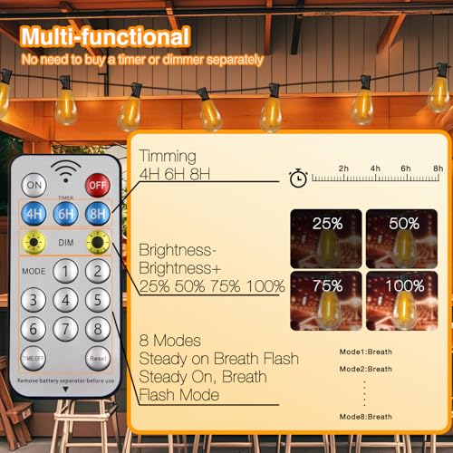 Multifunctional Remote Control: Use the included remote to set the brightness (25%, 50%, 75%, or 100%), 3 Timing Control: 4/6/8 Hrs and 8 lighting modes of this solar powered outdoor lights: Steady on, Breathing or Flashing. One remote —no extra timers and dimmer required, realize your desired vibe effortlessly.