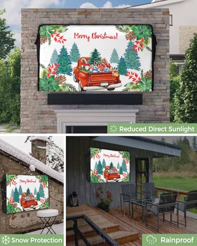 DecorLovee Outdoor TV Cover 80 to 85 Inches Weatherproof & Waterproof, Red Truck Christmas Outdoor TV Enclosure with Remote Control Pocket, Xmas Tree Snowflake Botanical TV Screen Protectors