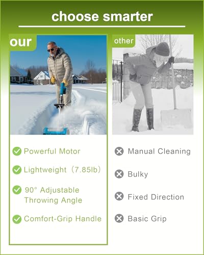 ?Lightweight & Senior-Friendly, Ergonomic Design?Battery snow shovel weighs only 7.85 pounds, this battery powered snow shovel is designed for everyone, especially seniors. The lightweight build & adjustable handle prevent back strain. promoting safe, independent snow removal and protecting your health during winter chores.
