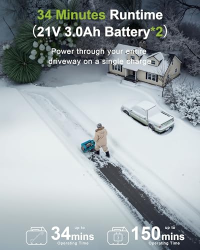?Dual Battery for Uninterrupted Use?DEGGE Cordless Snow Shovel conquer winter with 2 x 21V x 3-Ah batteries, enjoy extended runtime up to 34 minutes to clear your entire driveway, sidewalk, steps, patio. (Note:Warm up indoors for 30 minutes before use, cool the battery before charging.)