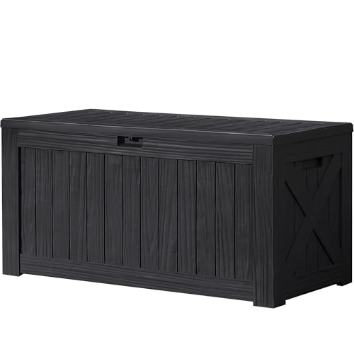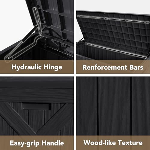 [ High-quality Resin ]: The deck storage box is made of water-resistant resin, complemented by a wood like grain design that maintains a fresh look even with all-weather use