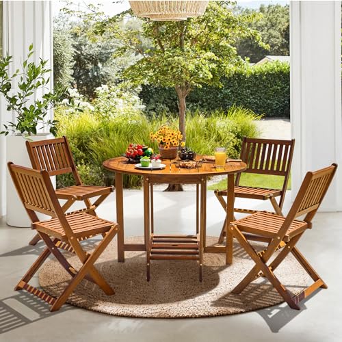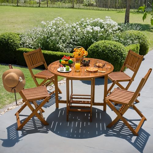 Devoko 5 PCS Patio Furniture, Patio Dining Set Acacia Wood Outdoor Table and Chairs, with 4 Folding Chairs and 37" Round Movable Table, Outdoor Dining Set for Lawn, Balcony, Garden (Light Brown)